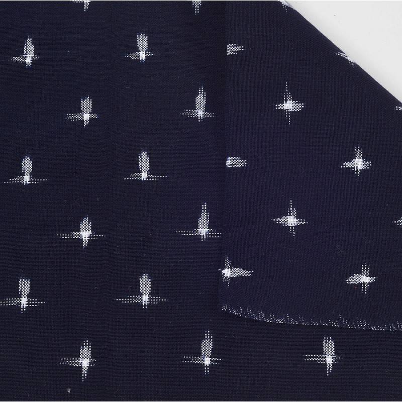 Tkanina wykonana techniką Kurume kasuri, 100% bawełna. Na granatowym tle białe gwiazdki - motyw rozgwieżdżonego nieba. Dzięki grubszej nici sprawia wrażenie tkanej ręcznie. Idealna do szycia ubrań czy do dekoracji wnętrz w stylu zen. Sprzedaż na mb lub w brytach po 12 mb.